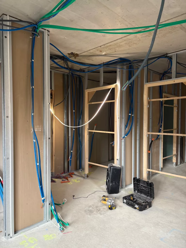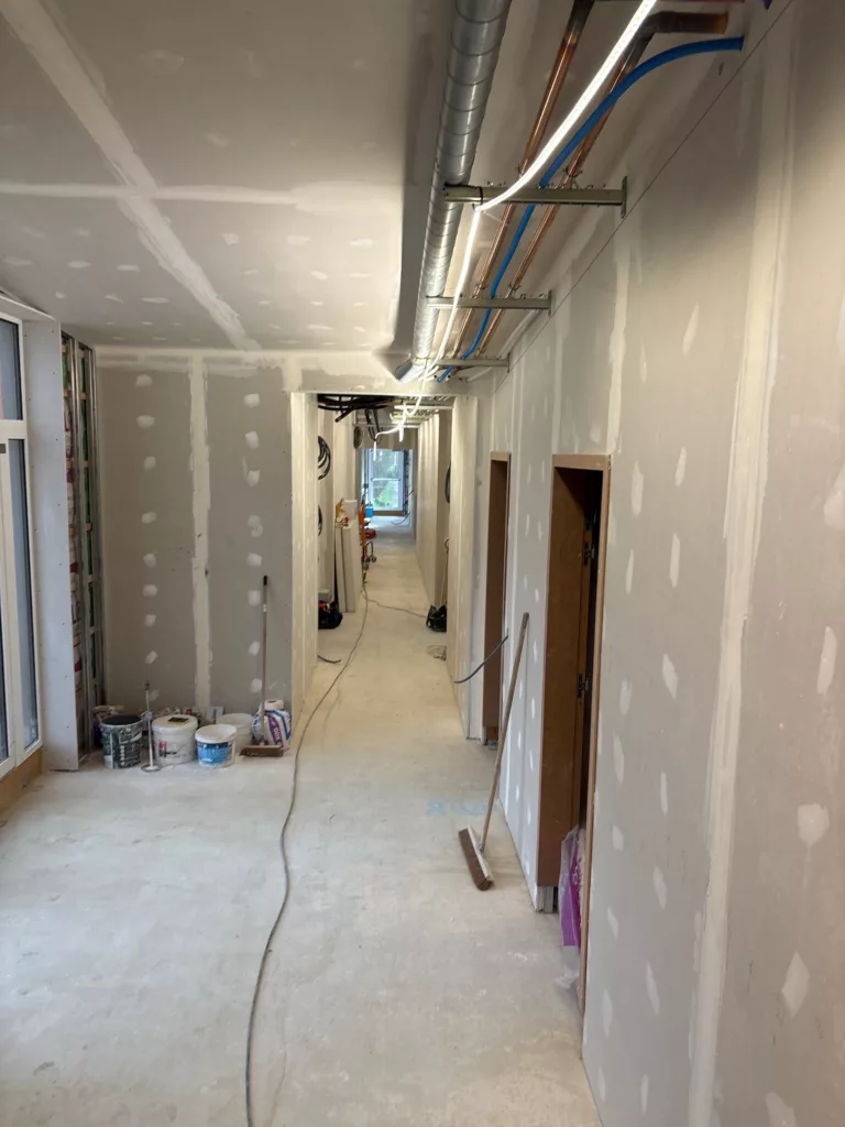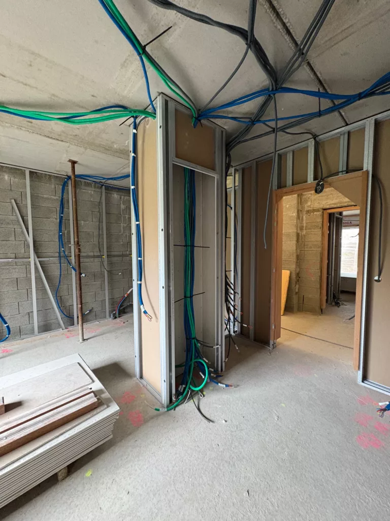 Le travail avance à l'intérieur. Les électriciens et plombiers prennent possession de la résidence. Les plaquistes travaillent en parallèle.